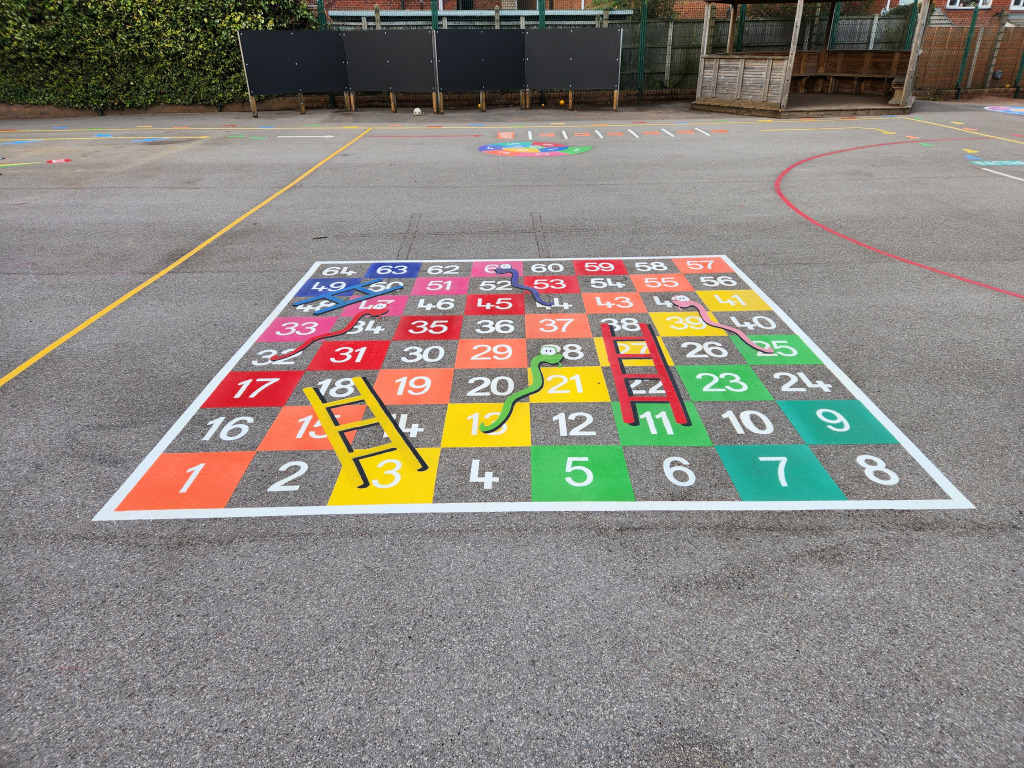At this school we removed some worn existing markings and filled the playground with a variety of new and vibrant thermoplastic markings. Starting with a full size netball court the rest of the markings with added around this. We installed a multicoloured footprint Daily Mile track to the perimeter of the area, a large Chessboard, Snakes and Ladders, a Number Target, Multicoloured Hopscotch, and an 8 Piece Adventure Trail. This has created a much brighter and more enjoyable playground with a wide range of activities for children of all ages.